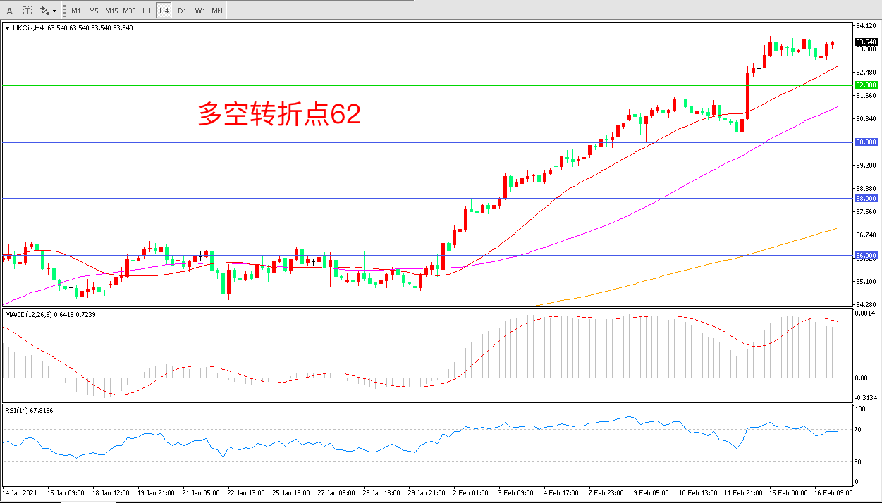 交易策略:  在62.00之上看涨,目标65.00 68.00