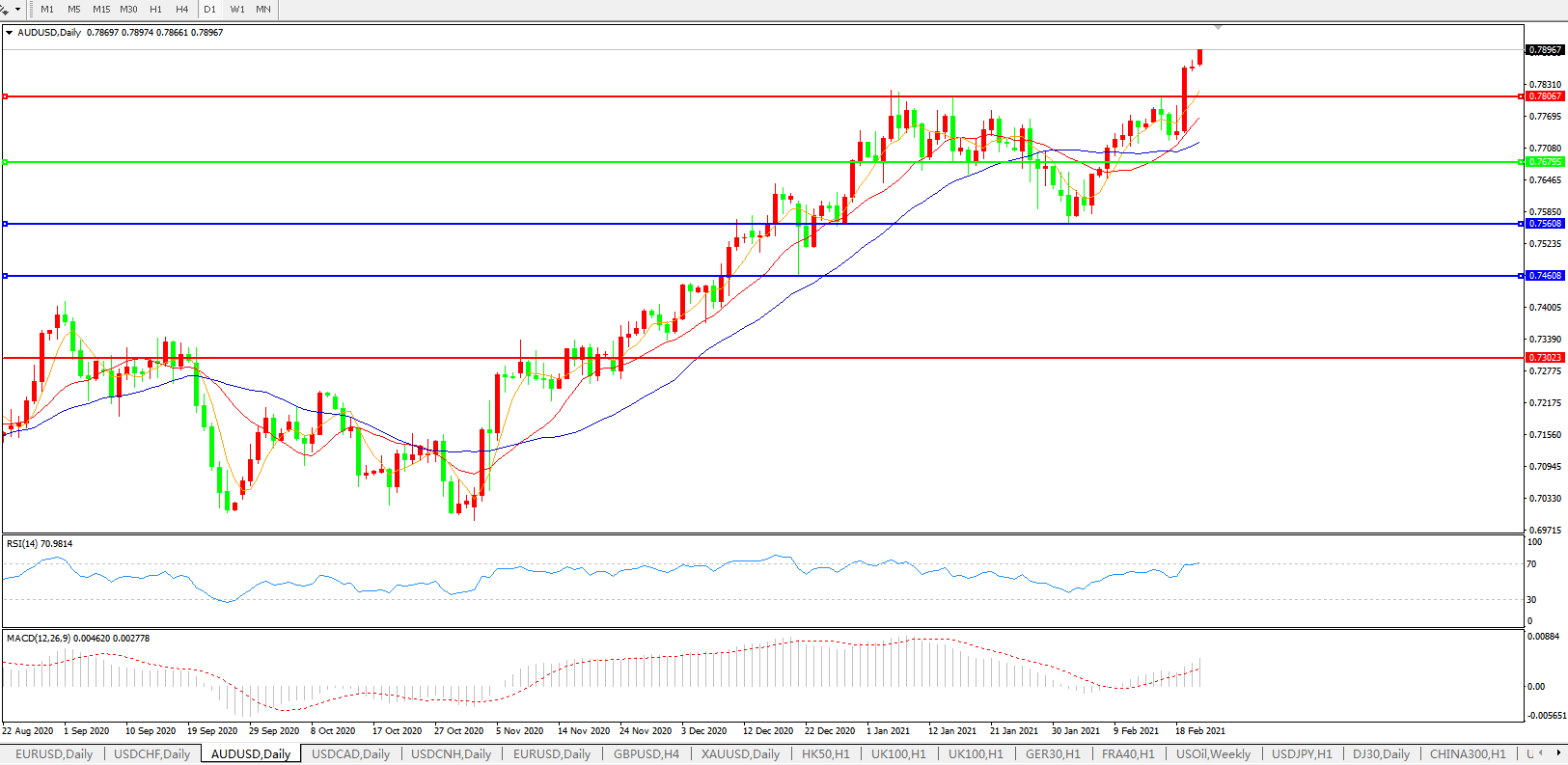交易策略:0.7680上方看涨,目标0.7800、0.7950