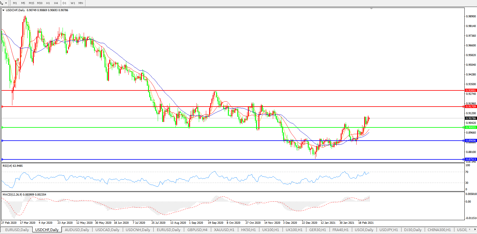 交易策略:0.9040上方看涨,目标0.9170、0.9300