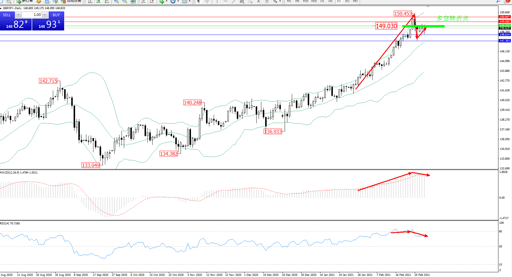 技术点评:多头动力延续布林带指标通道中上轨区间持续震荡上扬态势良好,高位抵达150.453附近节点后遇阻回撤,纠结于中上轨区间震荡,多头动力短暂遇阻,但上行趋势尚未有最终改变态势,布林带指标呈上行走势不断向上移动中,MACD指标处于多头区域维持平缓上扬后高位开始走平,RSI指标处于多头区域超买区80均衡线附近整理后开始缓慢下移走平;