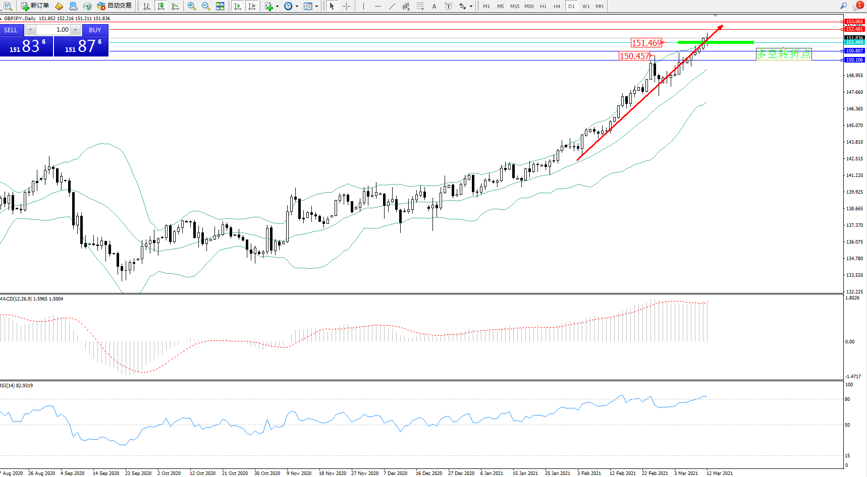 英镑兑日圆高位151.836附近震荡,鉴于市场已经消化2022年加息一次,2023年再加息一次的可能性,下周英国央行料将传达的乐观信号或对英镑只能产生温和提振,无法推动汇率大涨。预计美联储不会调整货币政策,而是继续发出信号,表示在2023年之前不会加息。市场还将关注美联储如何评论实际收益率上升的问题,以及最新的点阵图,但在QE资产购买方面可能不会做出调整。预计英国央行将维持原有的货币政策。预计日本央行也按兵不动,购买ETF的速度可能不会频繁上调,但幅度可能加大。扩大目前为0%的10年期国债收益率目标的容忍区间是有可能的,但因日本央行行长反对,所以不太可能现在就调整。