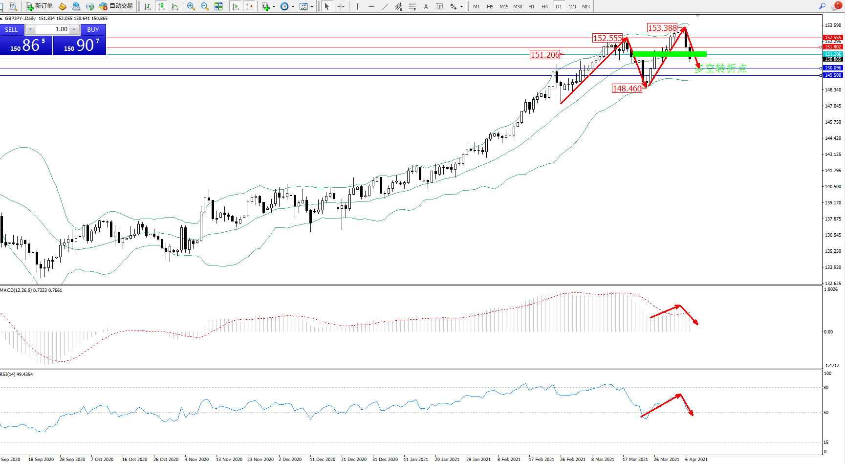备选策略:151.206上方看涨,目标151.802、152.555