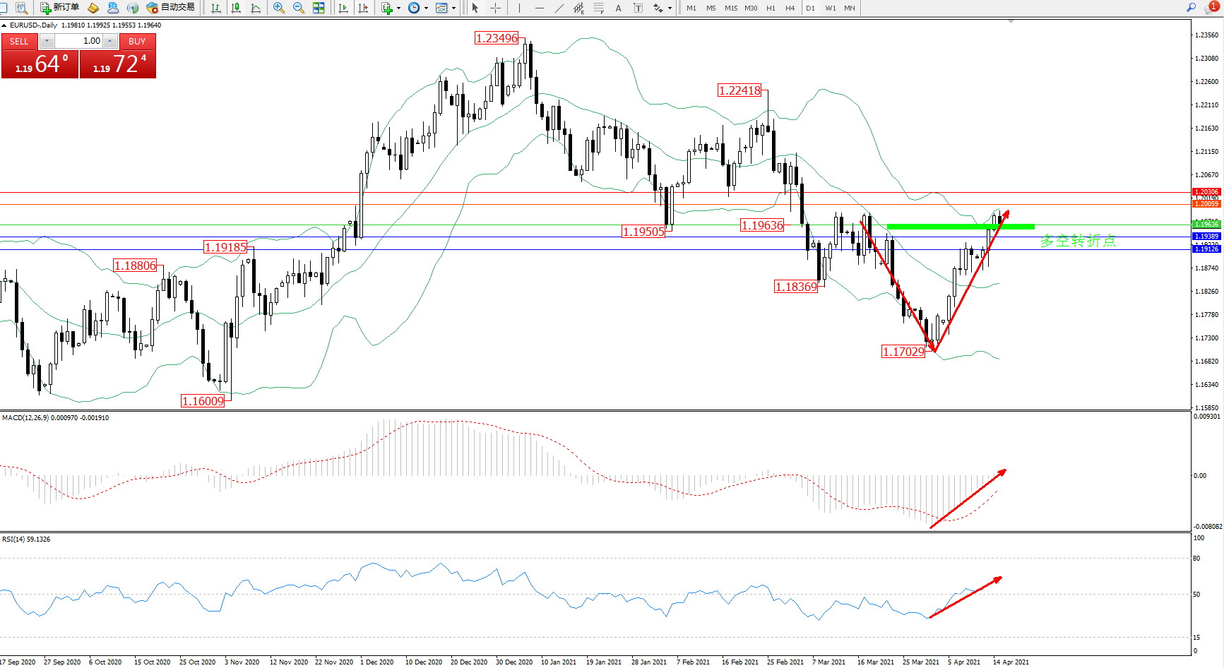 欧元兑美元持续拉升至布林带指标通道上轨下方1.19640附近震荡,2月底至4月初,美国经济复苏加速至温和步伐;欧盟执委会表示,计划每年发债约1500亿欧元直到2026年,为欧盟史无前例的复苏基金融资,该基金旨在推动欧盟经济更加绿色和数字化,这将让欧盟执委会成为最大的欧元债务发行人;美联储在未来几个月仍将保持宽松货币政策,而欧元区赶超美国的疫苗接种计划将支持欧元;全球风险情绪在本周稍早一度因国际地缘风险事件承压后,日内重新回暖,也推动了投资者进一步抛售避险美元,而欧元汇价也在欧洲多国疫情重新趋稳的前景下继续回升。