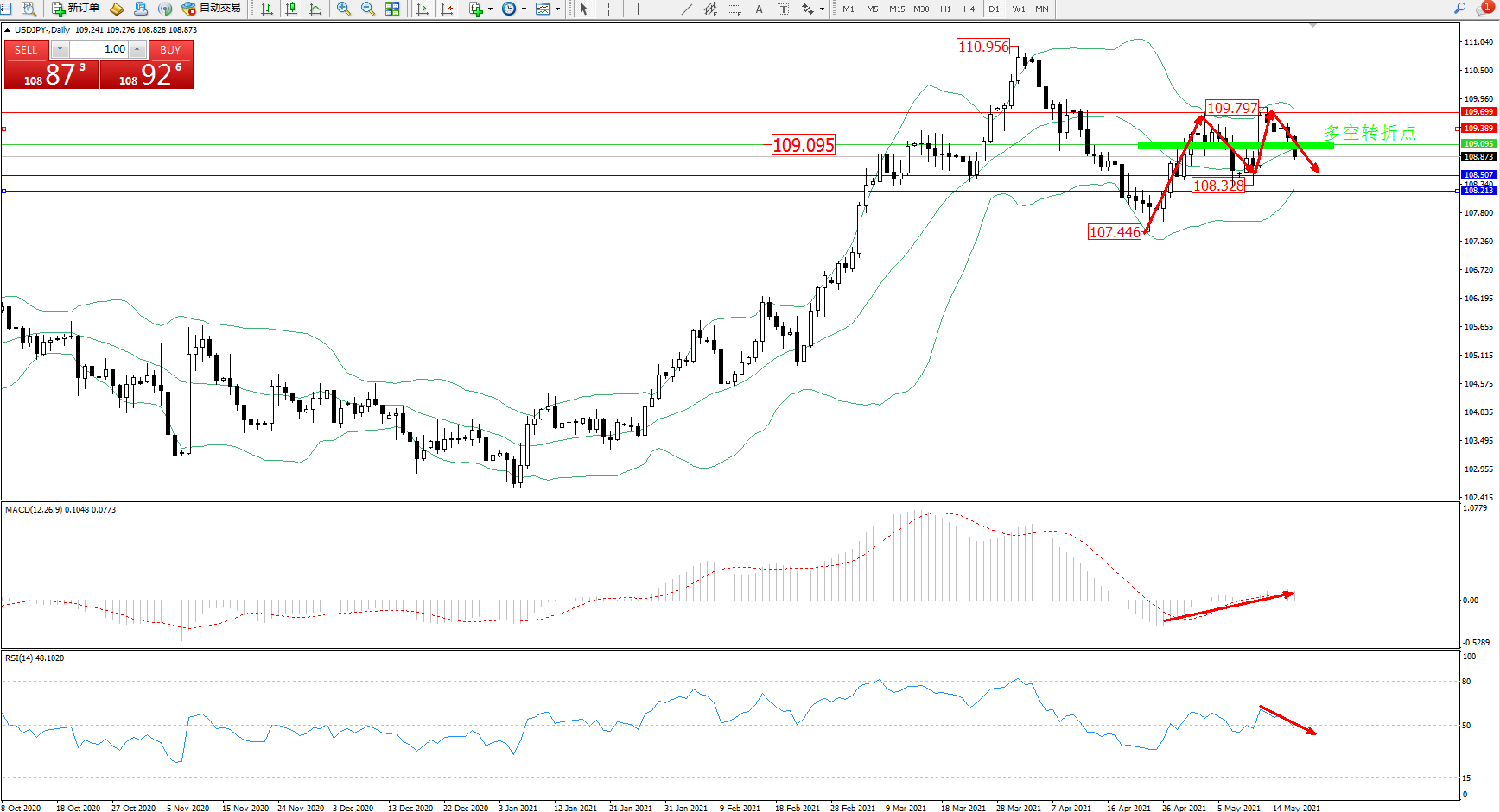 美元兑日圆持续下行至108.873附近震荡,日本物价涨幅有限,而且并未形成趋势。日本第一季国内生产总值(GDP)数据相当疲弱,也暗示日本央行将在更长时期内维持政策稳定。在制造业出口的帮助下,预计最早将在本季度恢复增长。作为全球第三大经济体,日本在2020年下半年实现了增长,但在今年1 - 3月这一季度的年化经济收缩了5.1%。私人支出比上一季度下降了1.4%。资本支出在上一季度强劲增长后也下降了1.4%。经济低迷只是日本从疫情中复苏的暂时中断。日本正受益于美国和中国这两个最大的贸易伙伴的复苏。海外对日本汽车和电子部件等产品的需求正在增长,有助于抵消国内旅游和餐饮等较弱的服务业的需求。