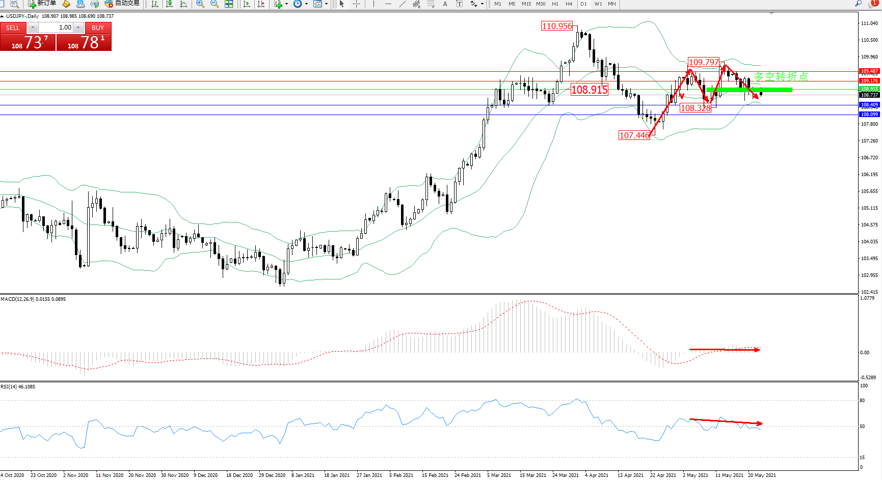 技术点评:低位多头动力持续震荡上扬,高位抵达布林带指标上轨附近109.797节点后遇阻回撤,维持在中轨下方继续窄幅震荡中,短期或有继续弱势平缓下移迹象,布林带指标呈缓慢收口走势平移后有继续徘徊迹象,MACD指标处于0轴线附近弱势徘徊中,RSI指标处于50均衡线附近维持窄幅震荡;