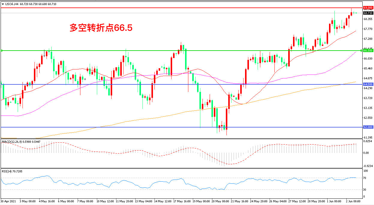 4小时图看,油价强势突破前期整理区间,整体表现十分强势,69美元成为中期阻力,66.5成为下方支撑,MACD红柱增加,RSI指标向上,日内震荡上行概率较大。