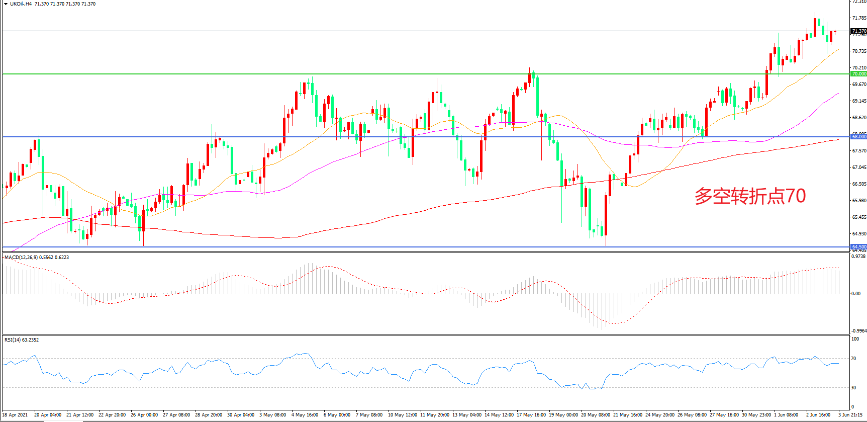 4小时图看,油价长阳拉升,突破前期整理区间,短期表现较为强势,21周期均线拐头向上,70美元成为下方支撑,MACD红柱增加,RSI指标走平,日内震荡上行概率较大。