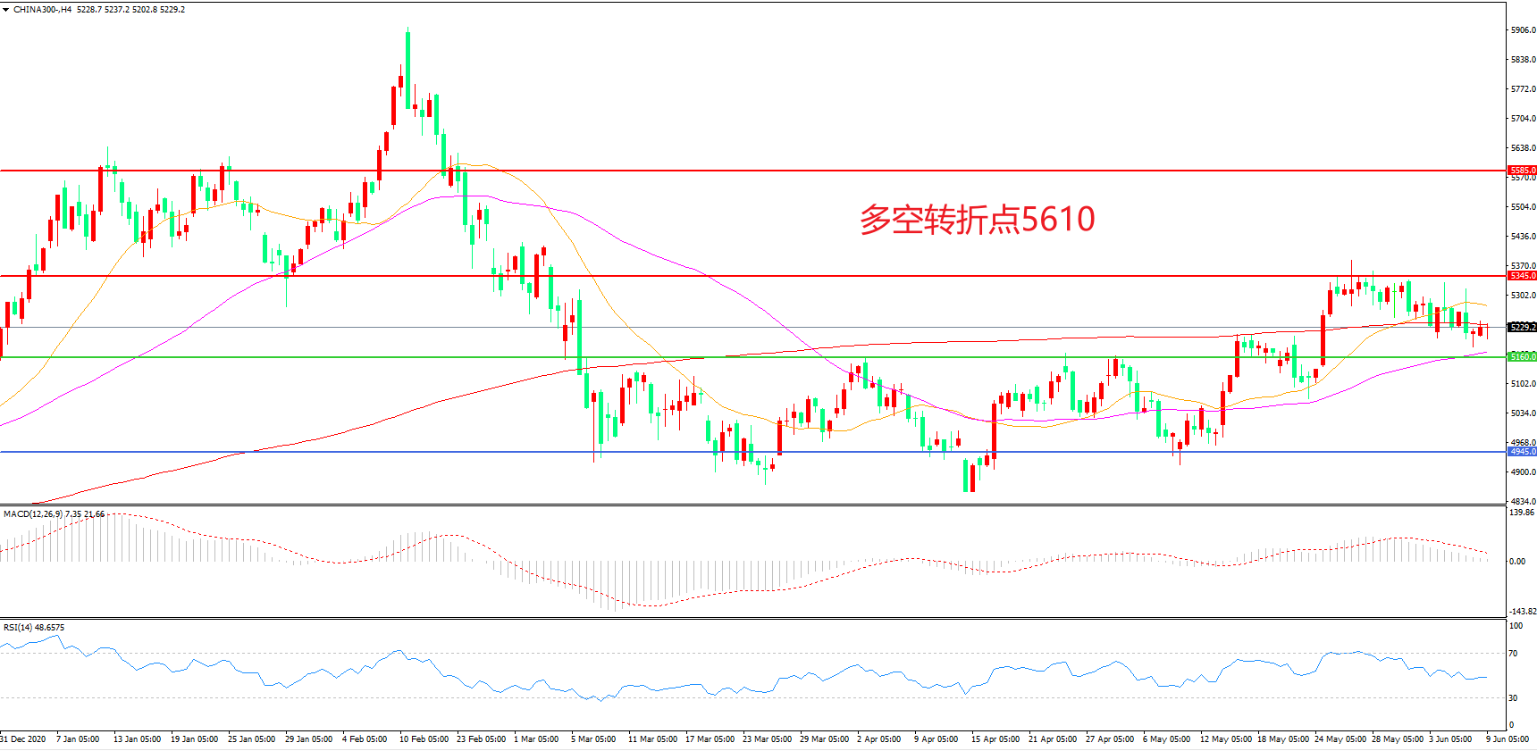 4小时图看,沪深300延续高位震荡,振幅逐渐收窄,方向性选择临近,5345成为上方阻力,55周期均线成为下方支撑,MACD红柱缩短,RSI指标走平,日内延续震荡概率较大。