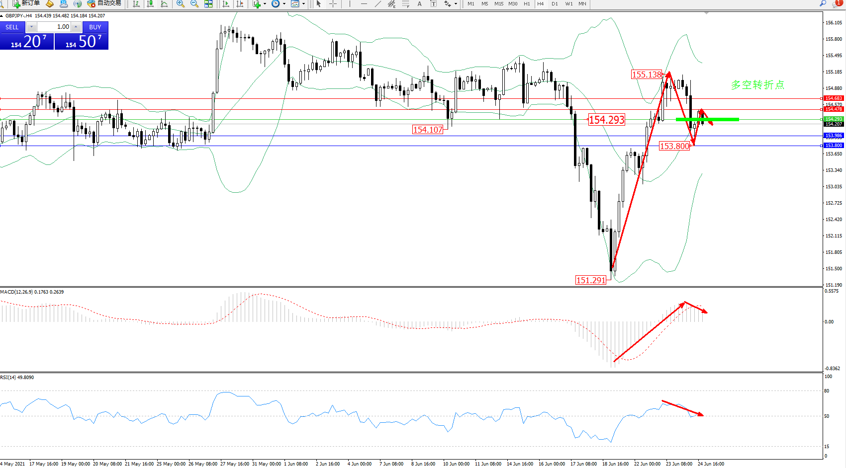 技术点评:多头动力低位强势拉升上扬至155.138位置遇阻开始整理回撤,触及153.800位置节点后开始巨震回升,纠结于布林带指标通道中轨附近节点开始震荡,短期或有继续回撤下行迹象,关注中轨附近节点,布林带指标呈张口走势后开始收口,MACD指标处于多头区域高位震荡后开始缓慢回撤平移,RSI指标纠结于50均衡线上方多头区域维持整理后处于50均衡线附近弱势徘徊中;