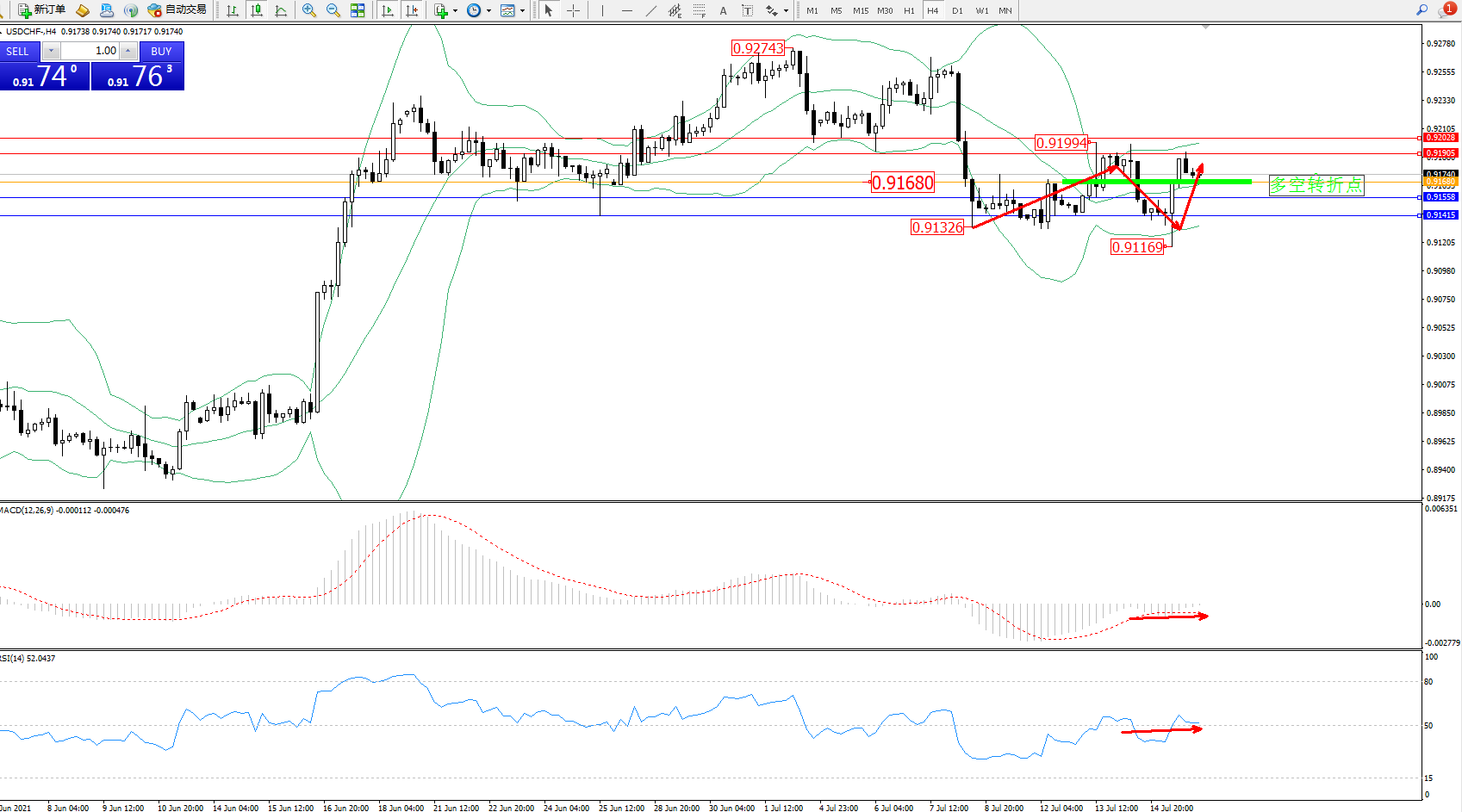 交易策略:0.91680上方看涨,目标0.91905、0.92028