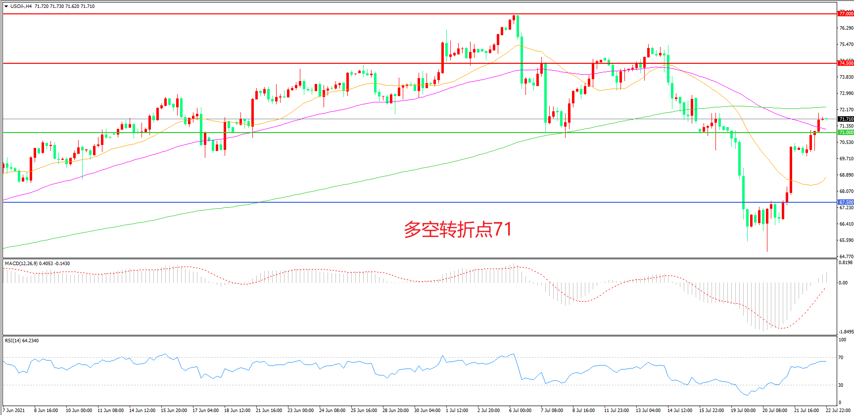 4小时图看,油价长阳拉升,收复前期失地,短线行情有所回暖,200周期均线成为短期阻力,71美元成为多空分水岭,均线系统走平,MACD红柱,日内震荡上行概率较大。