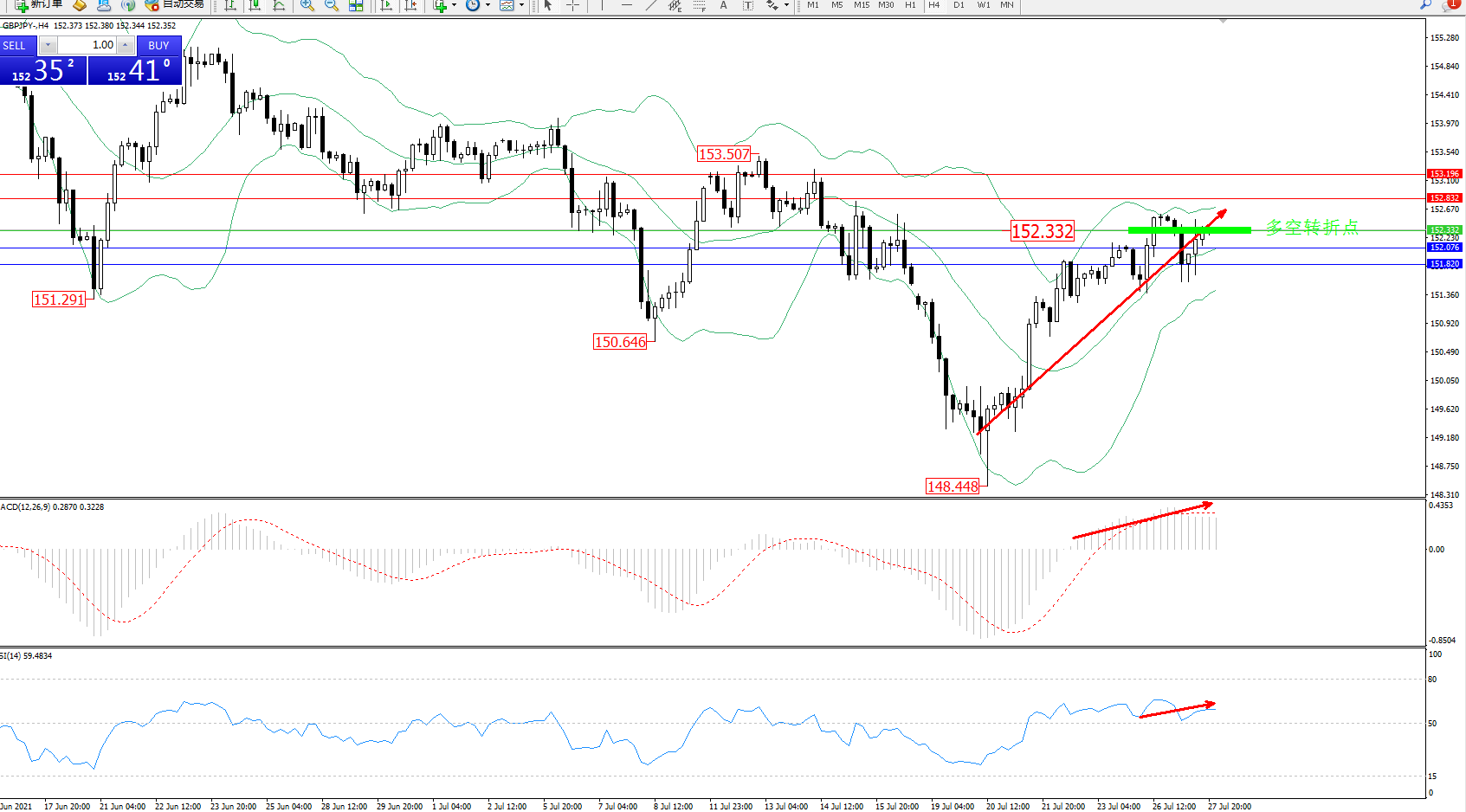 交易策略:152.332上方看涨,目标152.832、153.196