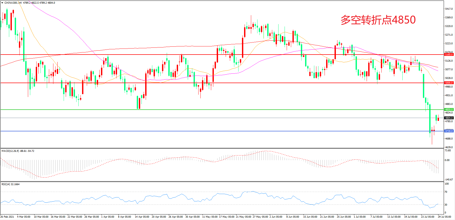 4小时图看,沪深300高开高走,短线行情有所企稳,4850成为上方阻力,4730成为下方支撑,MACD红柱增加,RSI指标向上,日内延续震荡概率较大。