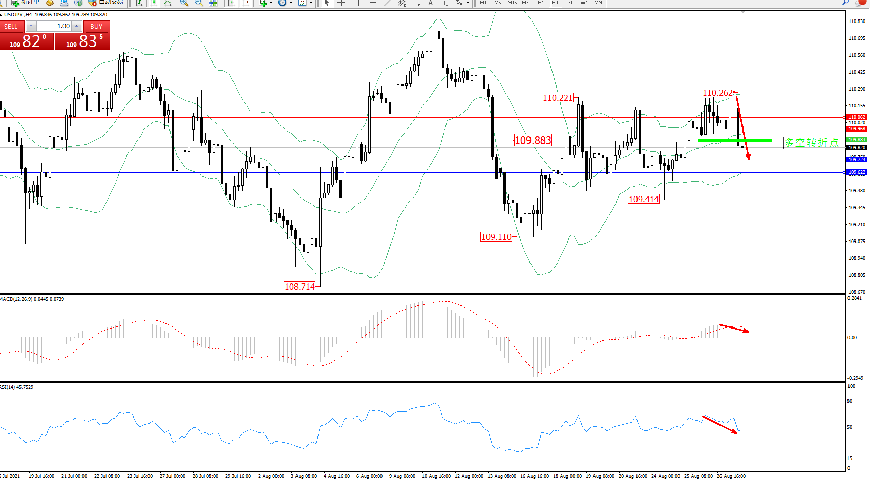 技术点评:高位维持在布林带指标通道中上轨区间持续震荡,期间多次来回触及中上轨区间节点,高位抵达110.262位置后遇阻回撤,跌破布林带指标中轨后有继续回撤迹象,布林带指标呈上行走势后开始有收口迹象,MACD指标处于0轴线上方多头区域窄幅整理,RSI指标处于50均衡线上方弱势徘徊后回撤下行;