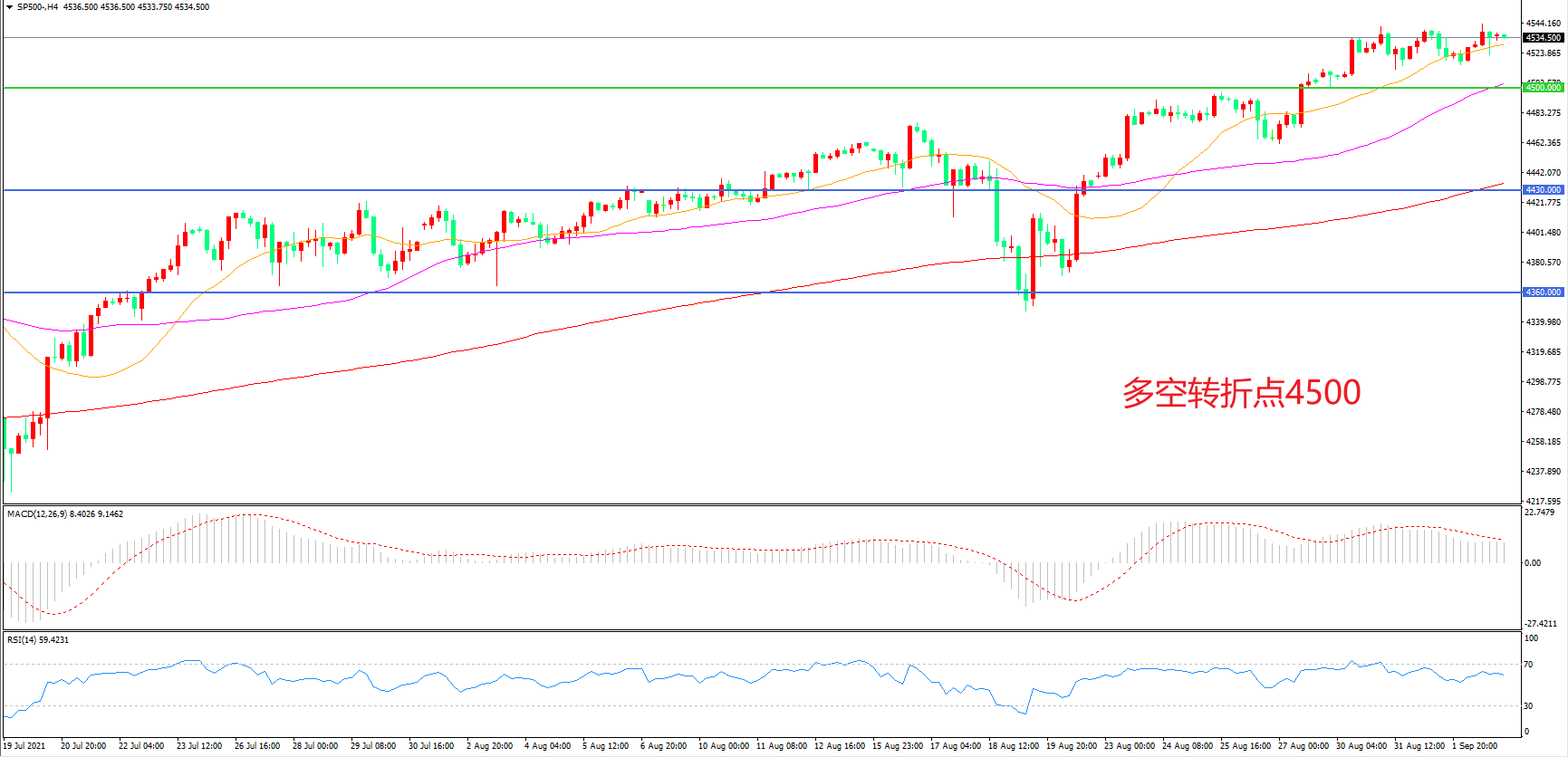 4小时图看,标普500连续拉升后延续高位震荡,整体表现偏强,均线系统呈多头排列,4500成为短期多空分水岭,MACD红柱增加,RSI指标走平,日内震荡上行概率较大。