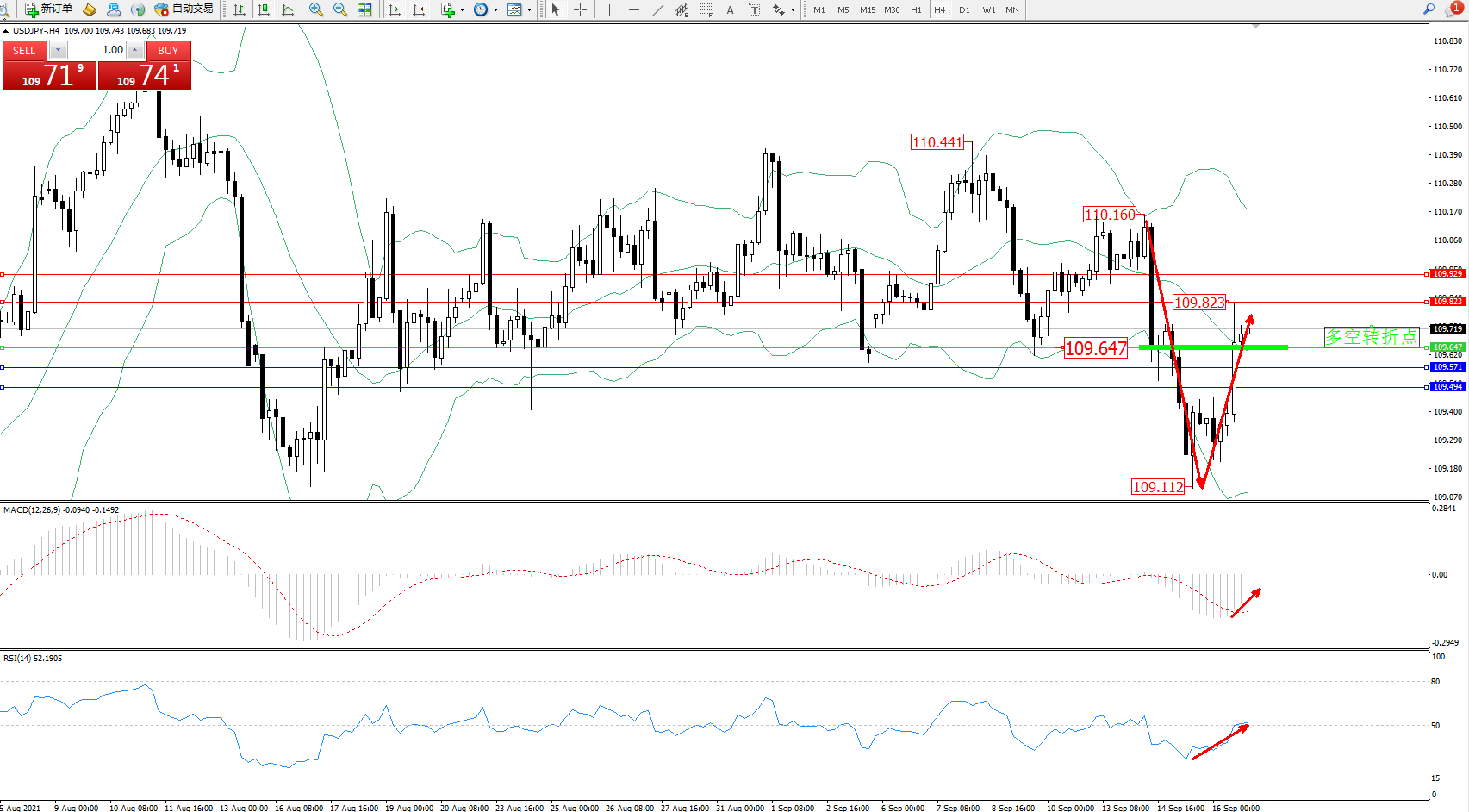 技术点评:空头动力持续震荡下行后,低位109.112附近得到支撑,呈V型反转拉升走势,突破布林带指标中轨附近节点后开始短暂整理,多头动力有短期急速回升迹象,布林带指标呈张口走势后开始张口,MACD指标处于空头区域低位整理缓慢上移,RSI指标处于空头区域低位整理上移至50均衡线附近徘徊;