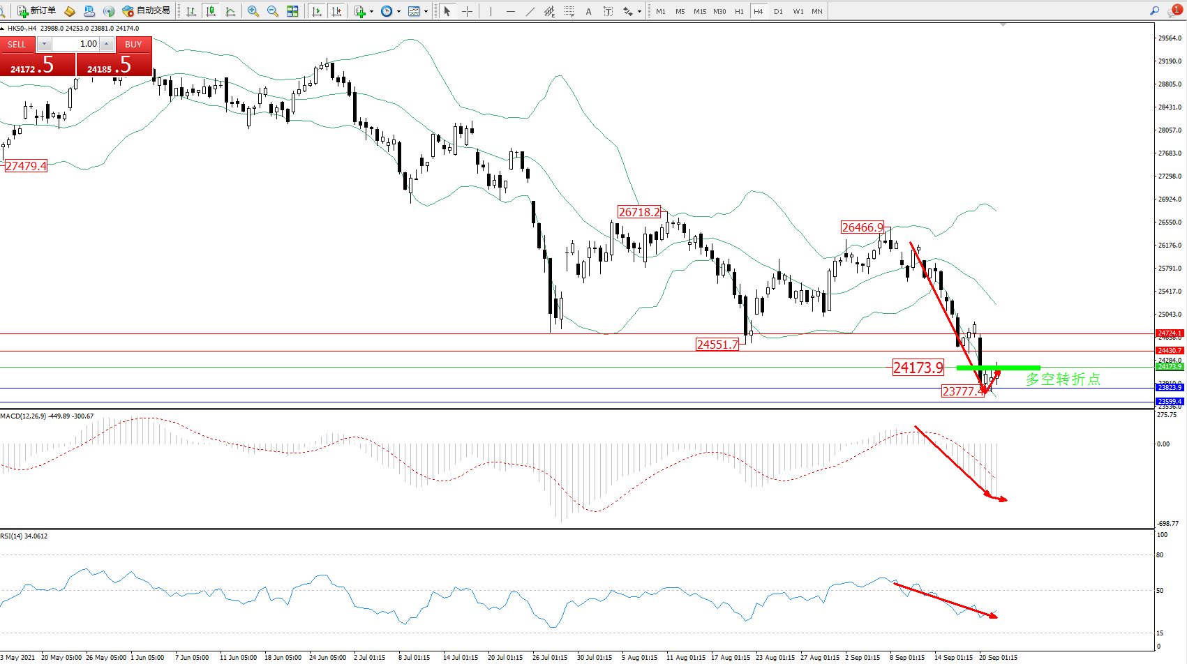 技术点评:空头动力延续布林带指标通道下轨附近持续震荡下行,低位抵达23777位置后得到短暂支撑反转回升,多头动力有短期反弹迹象,但下行趋势态势良好,布林带指标呈下行趋势持续中,MACD指标处于空头区域持续震荡下行,RSI指标处于50均衡线下方空头区域维持整理平移中;