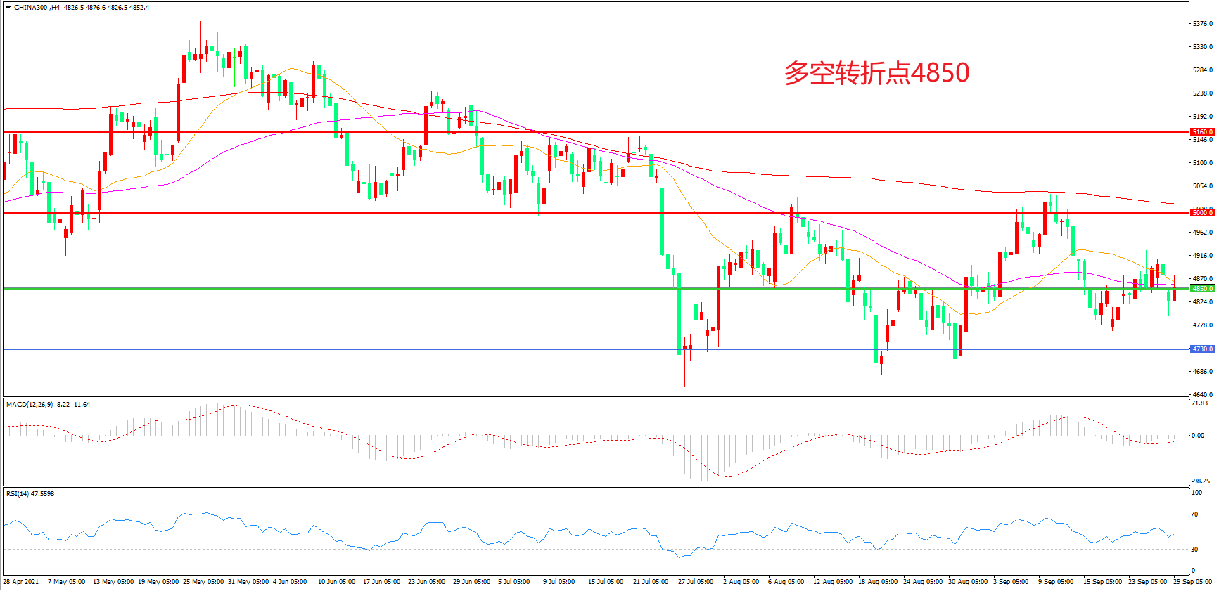 4小时图看,沪深300低开低走,整体受制于4850一线,均线系统逐渐走平,MACD绿柱缩短,RSI指标走平,日内延续震荡概率较大。