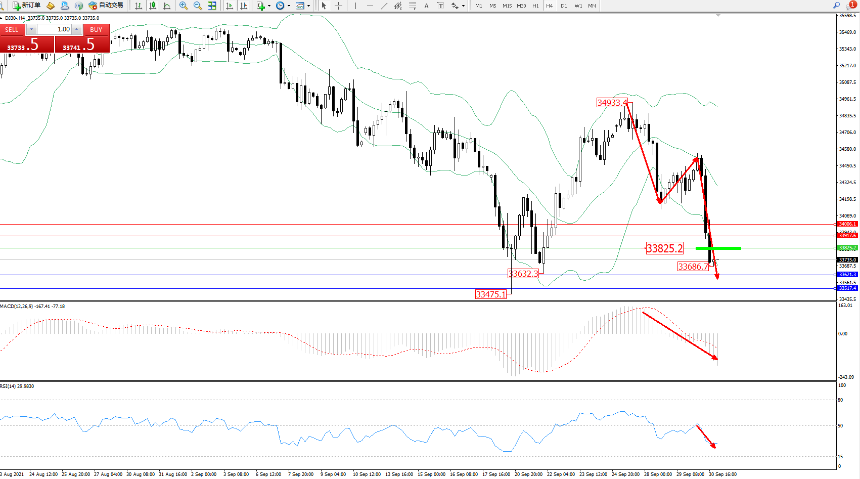 技术点评:空头动力延续布林带指标通道中下轨区间持续震荡下挫,低位抵达33686位置后开始震荡,短期空头动力有进一步向下移动态势,布林带指标呈张口走势持续中,MACD指标处于空头区域持续震荡下行,RSI指标处于空头区域持续向下移动中;