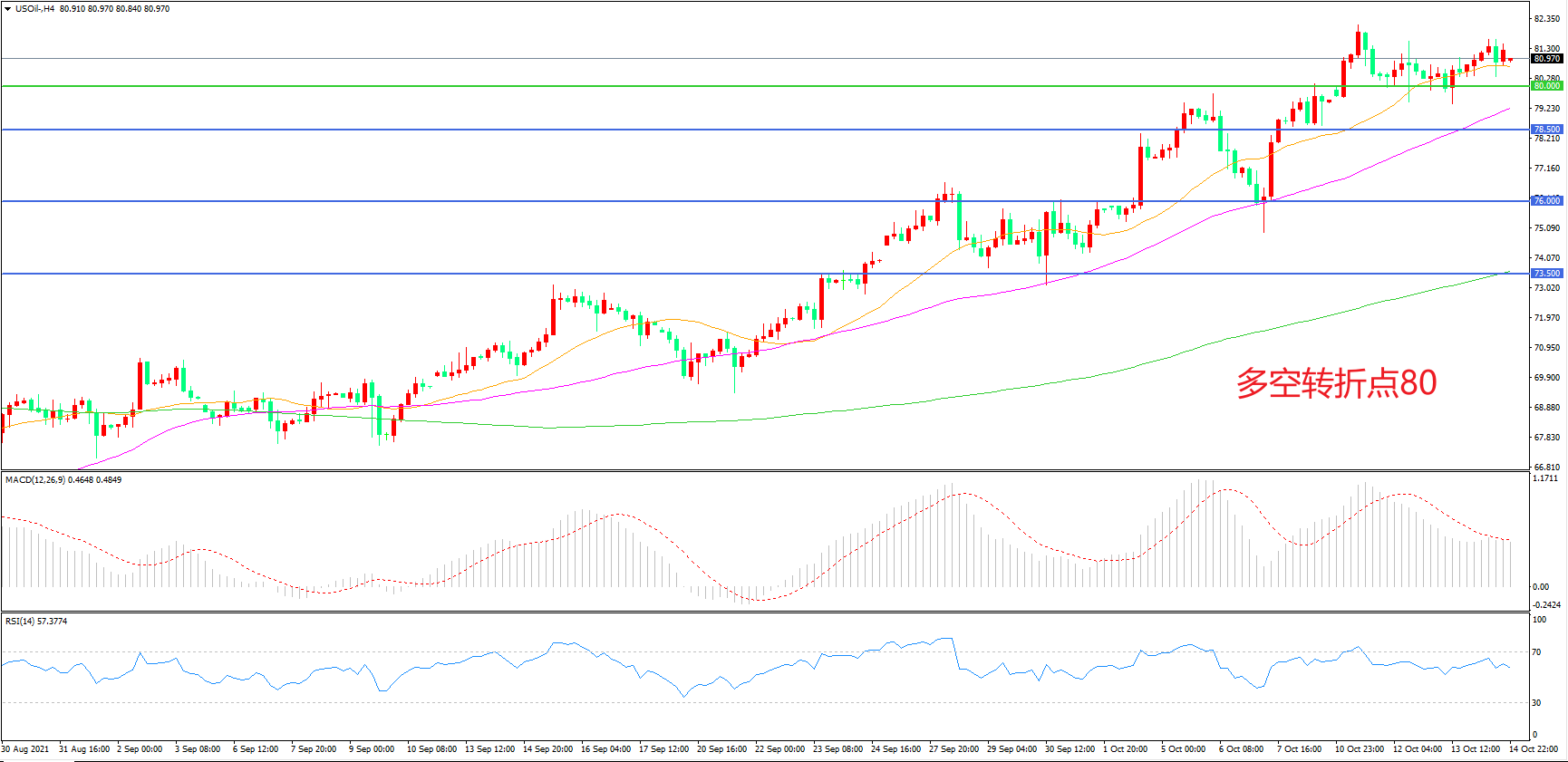 4小时图看,油价整体呈现高位震荡形态,均线系统呈多头排列,MACD红柱缩短,RSI指标走平,日内延续震荡概率较大。