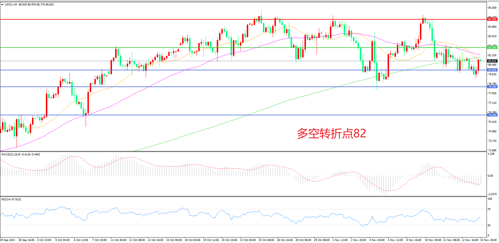 周一(11月15日),沙特能源部长表示石油库存将会从12月份增加,阿联酋能源部长表示明年第一季度将会有石油供应过剩出现,OPEC国家的表态令油价再度承压,美国WTI原油探底回升,收报80.82美元/盎司。目前拜登还没有决定释放战略储备,而且签署了基建方案,预计即将公布的IEA月报和EIA数据表现将给油价带来更多指引。