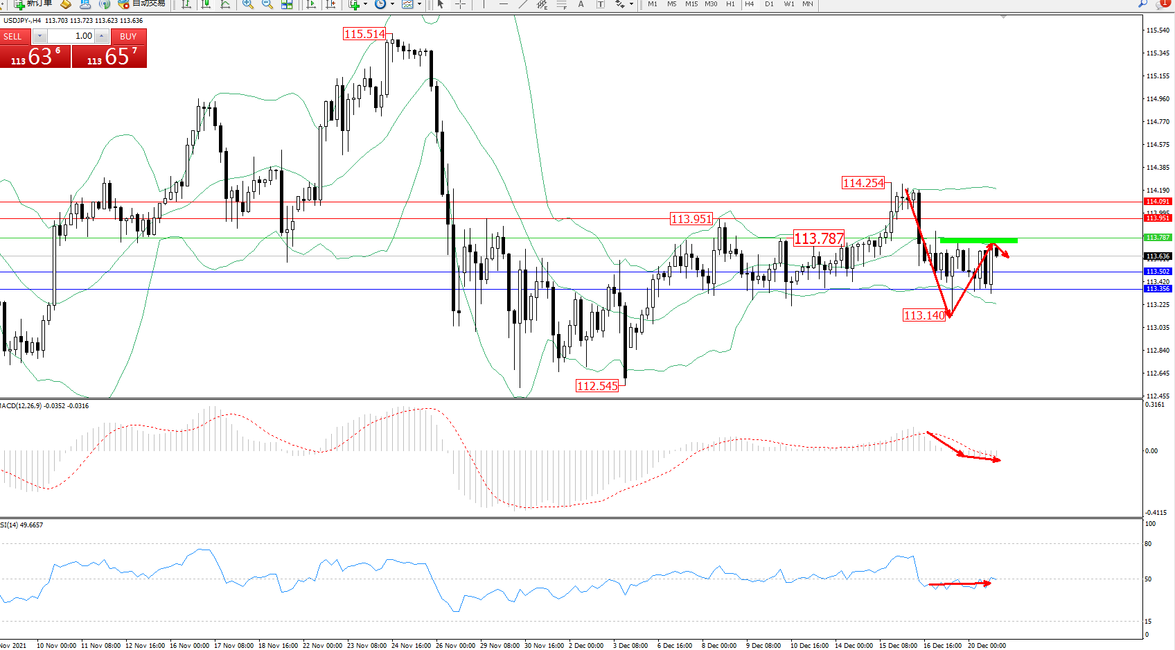 交易策略:113.787下方看跌,目标113.502、113.356