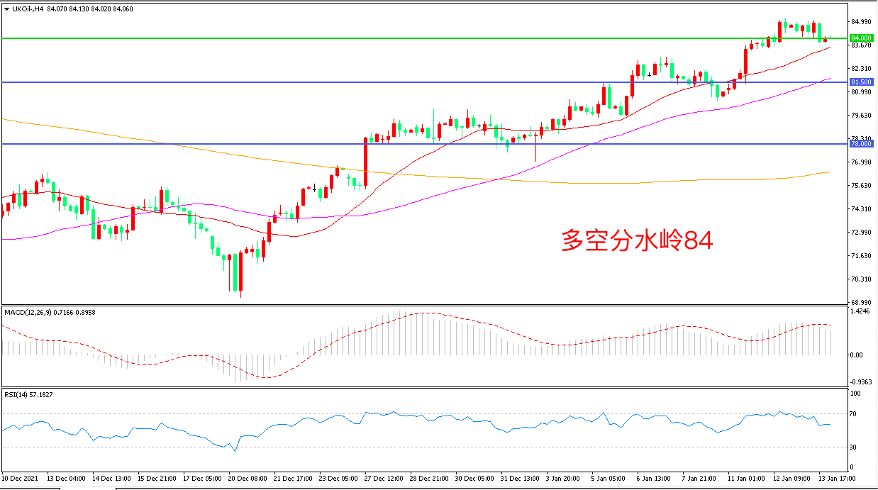 周四(1月13日),因全球奥密克戎变种病例激增,风险情绪回落,连续上涨的油价出现小幅回调,布伦特原油小幅回落,收报84.00美元/桶。由于哈萨克斯坦抗议活动扰乱了铁路运行,哈萨克斯坦的石油日产量与1月4日相比下降了3.7%,随着冬季需求的回升,油价依然具备较强支撑。