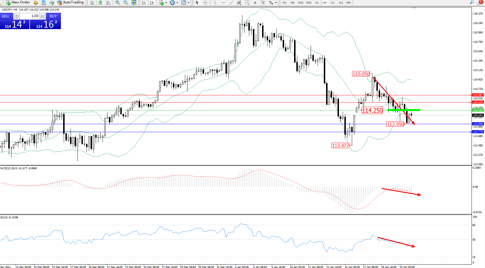 技术点评:空头动力延续布林带指标中下轨区间持续震荡下行,短期抵达113.950附近节点后得到支撑开始震荡,但下行趋势态势良好,布林带指标呈收口走势后开始张口,短期有进一步向下移动态势,MACD指标处于0轴线下方维持弱势平缓下行,RSI指标处于50均衡线下侧持续震荡中;