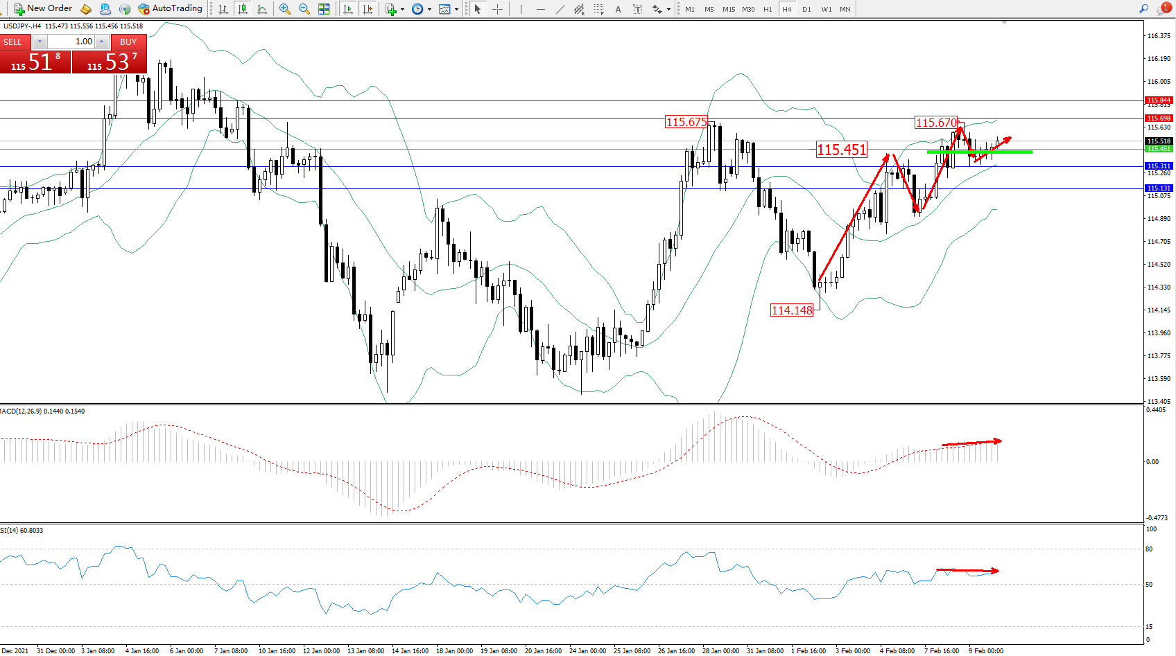 交易策略:115.451上方看涨,目标115.698、115.844