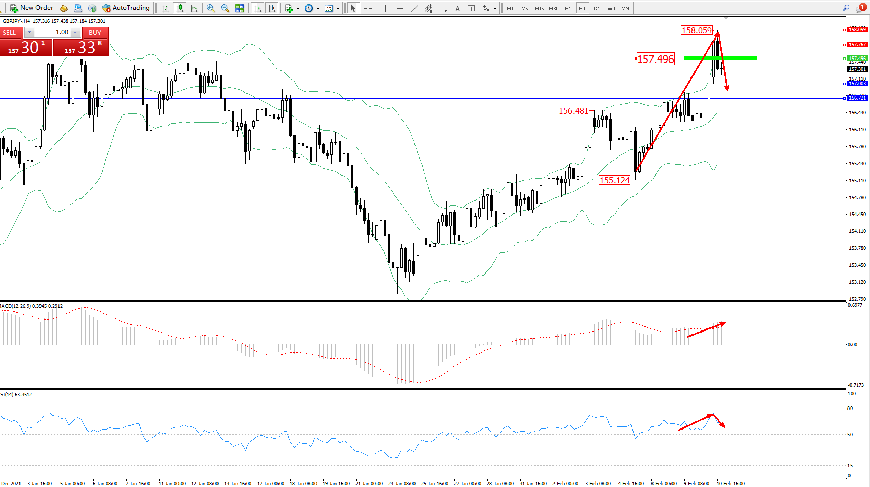 备选策略:157.496上方看涨,目标157.767、158.059