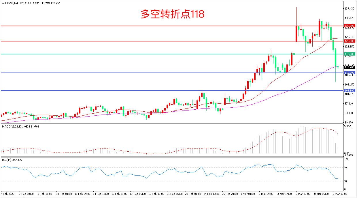 4小时图看,油价长阴连续下坡,前期涨势被吞噬殆尽,118美元成为多空分水岭,MACD红柱缩短,RSI指标走平,日内延续震荡概率较大。