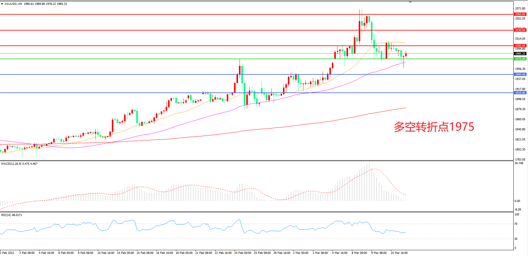 4小时图看,金价以1975为依托延续窄幅震荡,上行趋势暂缓,2000美元成为多空分水岭,均线系统走平,MACD红柱缩短,RSI指标走平,日内延续震荡概率较大。