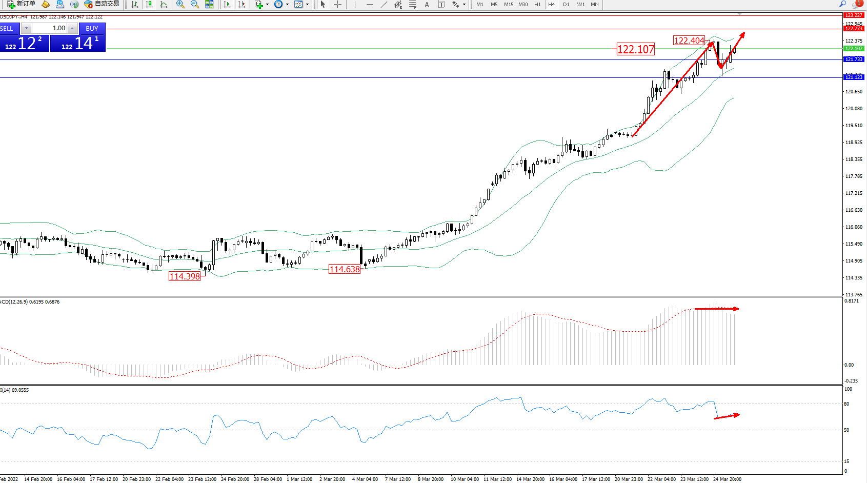 技术点评:多头动力延续布林带指标通道中上轨区间持续震荡上扬,高位抵达122.404附近节点开始整理,短期纠结于高位维持窄幅震荡中,布林带指标呈上行趋势走势态势良好,高位缓慢收口后有张口迹象,MACD指标处于多头区域高位维持整理平移,RSI指标处于多头区域维持整理中;
