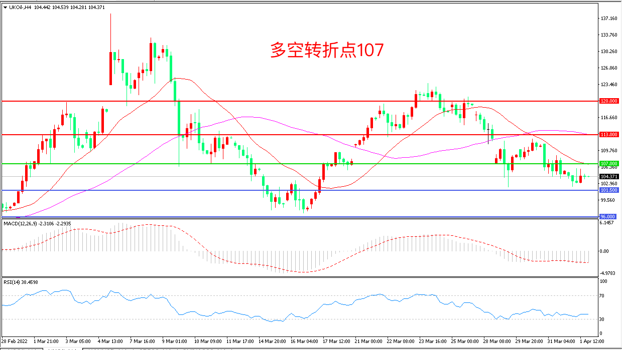 4小时图看,油价连续下行,短线走势陷入低迷,21周期均线成为上方阻力,107美元成为多空分水岭,MACD绿柱增加,RSI指标走平,日内延续震荡概率较大。