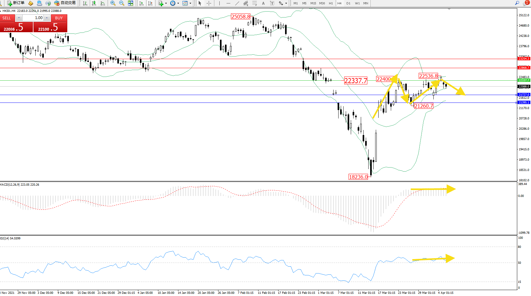 技术点评:多头动力延续布林带指标通道中上轨区间持续震荡上扬,高位抵达22536位置节点后开始回撤,波幅空间逐渐收窄,布林带指标呈收口走势中,空头动力开始伺机入场,MACD指标处于多头区域维持整理平移,RSI指标处于多头区域维持窄幅徘徊中;