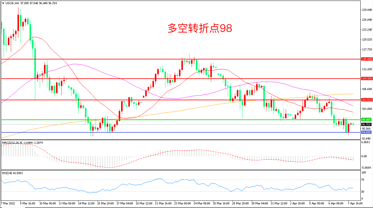 4小时图看,油价触碰98一线后再度回落,短期走势低迷,均线系统呈空头排列,MACD绿柱增加,RSI指标走平,日内延续震荡概率较大。