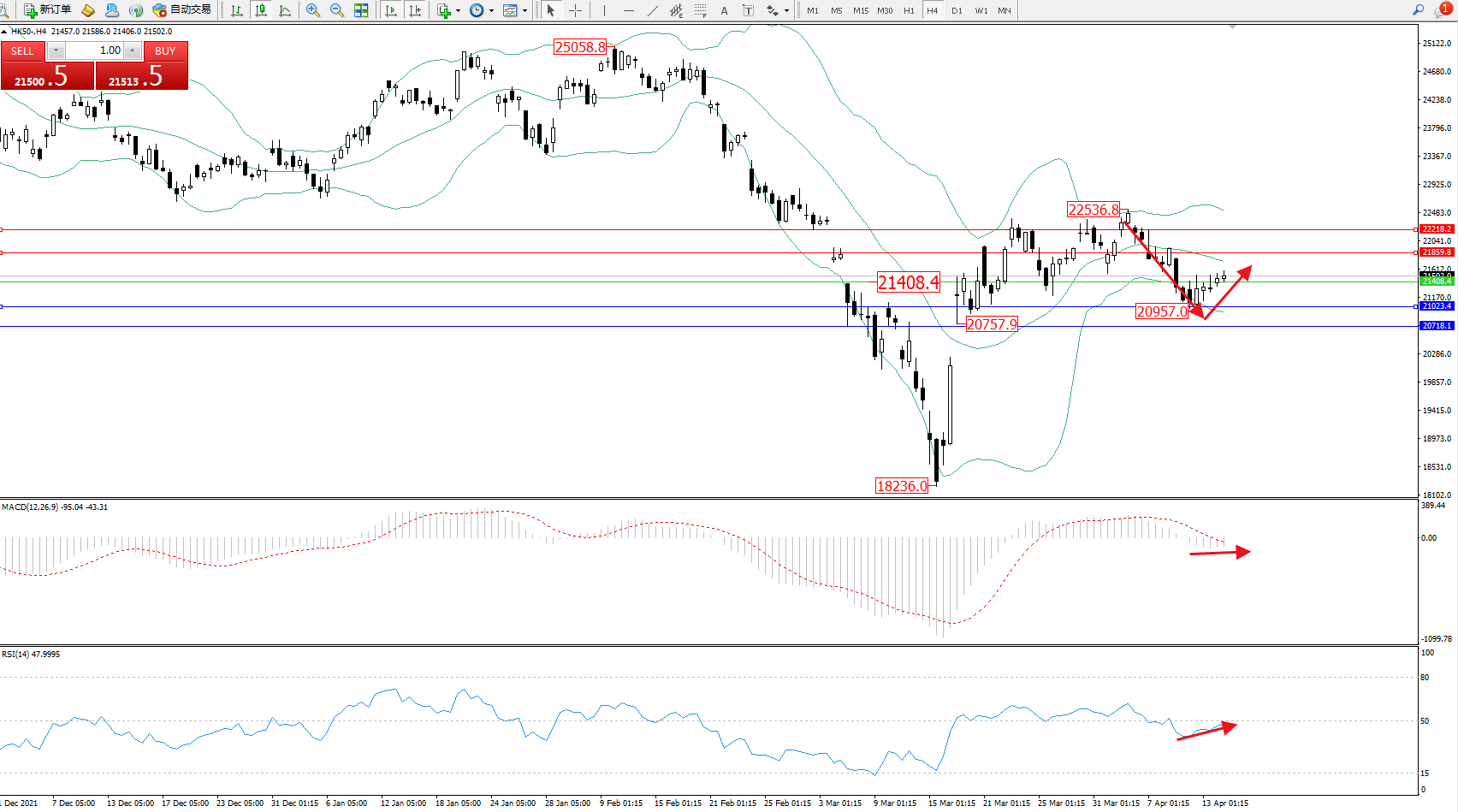技术点评:空头动力延续布林带指标下轨弱势下挫,低位抵达20957位置附近得到支撑反转上移,多头动力维持弱势整理缓慢上移,布林带指标呈缓慢张口走势后开始收口,MACD指标处于0轴线下方弱势徘徊中,RSI指标处于空头区域维持窄幅整理弱势上移;