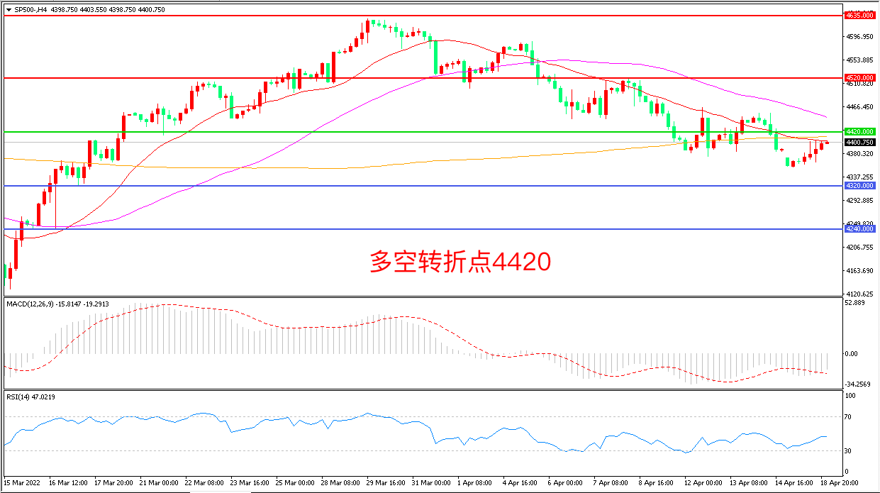 4小时图看,标普500连续下行后小幅反弹,横盘迹象明显,21周期均线成为阻力,4420成为多空分水岭,MACD绿柱缩短,RSI指标走平,日内延续震荡概率较大。