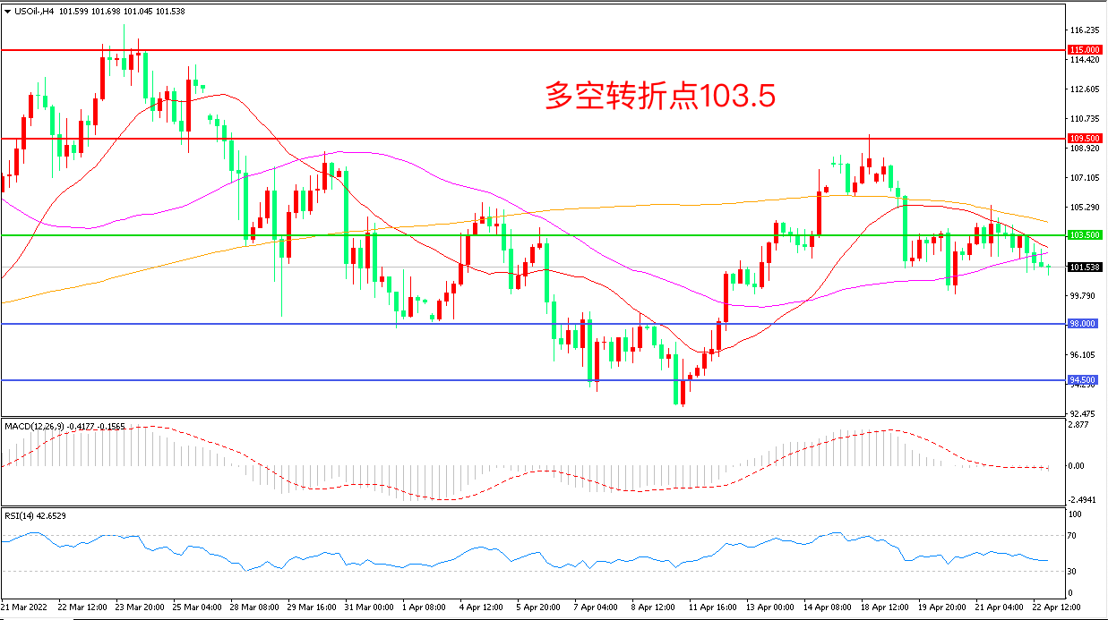 4小时图看,油价触碰103.5阻力后再度回落,上行动力略显不足,MACD红柱缩短,RSI指标走平,日内延续震荡概率较大。