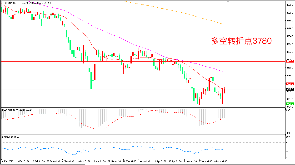 4小时图看,沪深300低开低走后强势拉升,短线有企稳迹象,但由于前期跌幅过多,形态上仍然偏弱,MACD绿柱缩短,RSI指标走平,日内低位震荡概率较大。