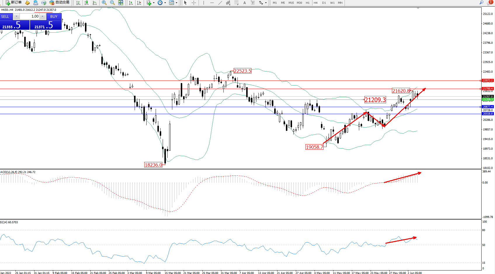 交易策略:21209上方看涨,目标21700、22072