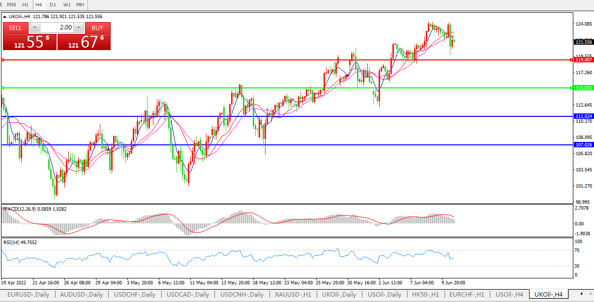 技术面简析:4小时图看,油价高位盘整,短线稍显弱势 MACD量能柱缩短RSI指标走弱,日内继续走弱概率较大。