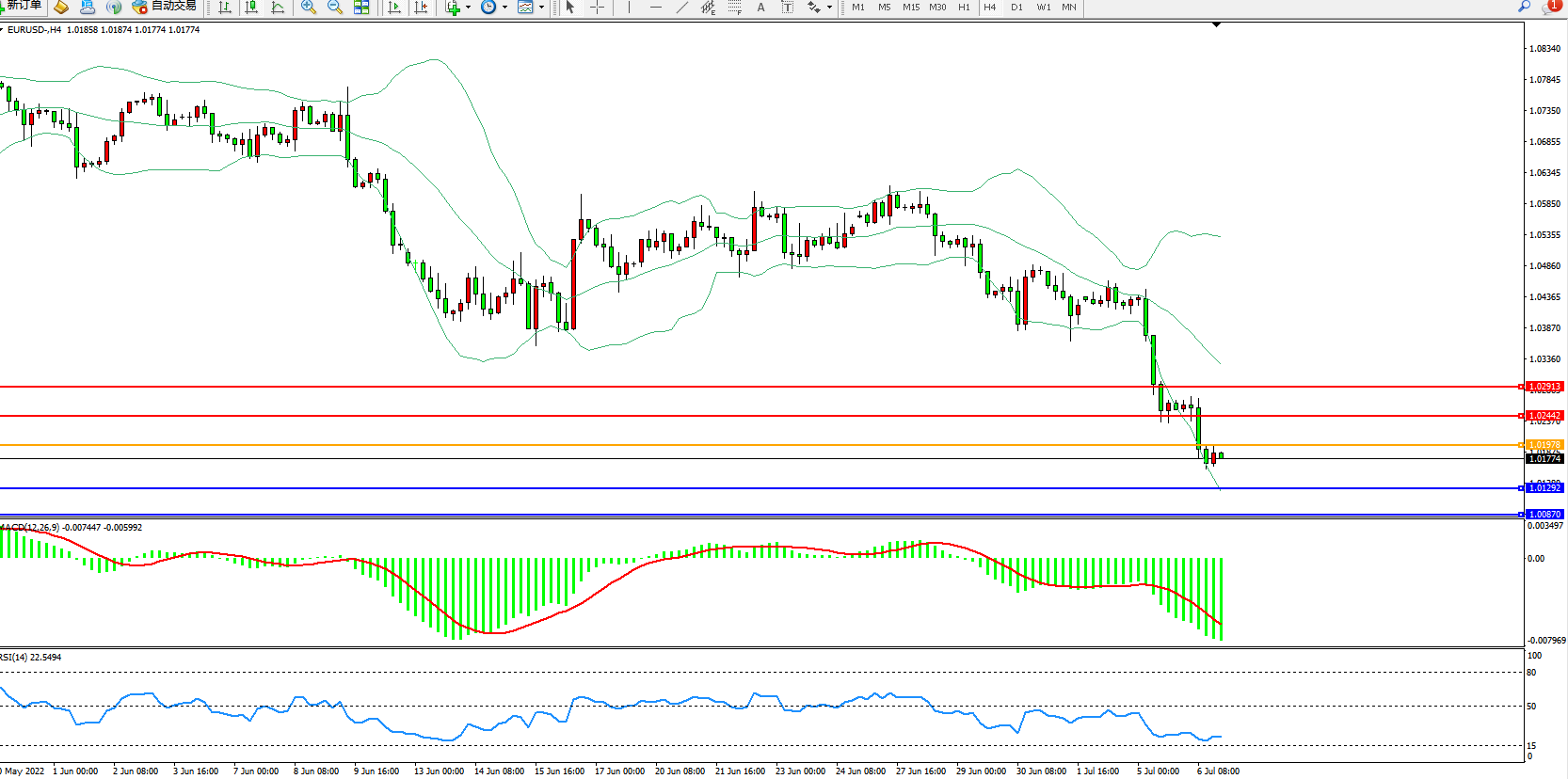 欧元兑美元维持下行至101.774附近震荡,欧洲央行支持欧元区负债累累成员国的计划存在异议,而且欧元区6月商业活动增长急剧放缓,下半年需求不确定性增加。预计2022年欧元区GDP增速为2.7%,比2021年低270个基点,2023年为1.9%。