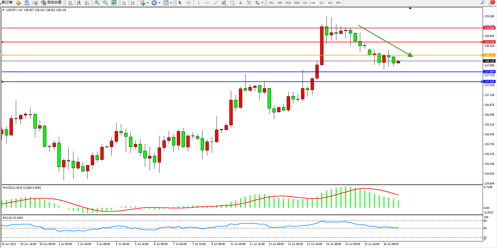 4小时图看:高位空头动力维持弱势整理缓慢下行,短期跌势尚未有止步迹象,MACD指标处于多头区域高位整理下移,RSI指标处于50均衡线附近弱势徘徊中;
