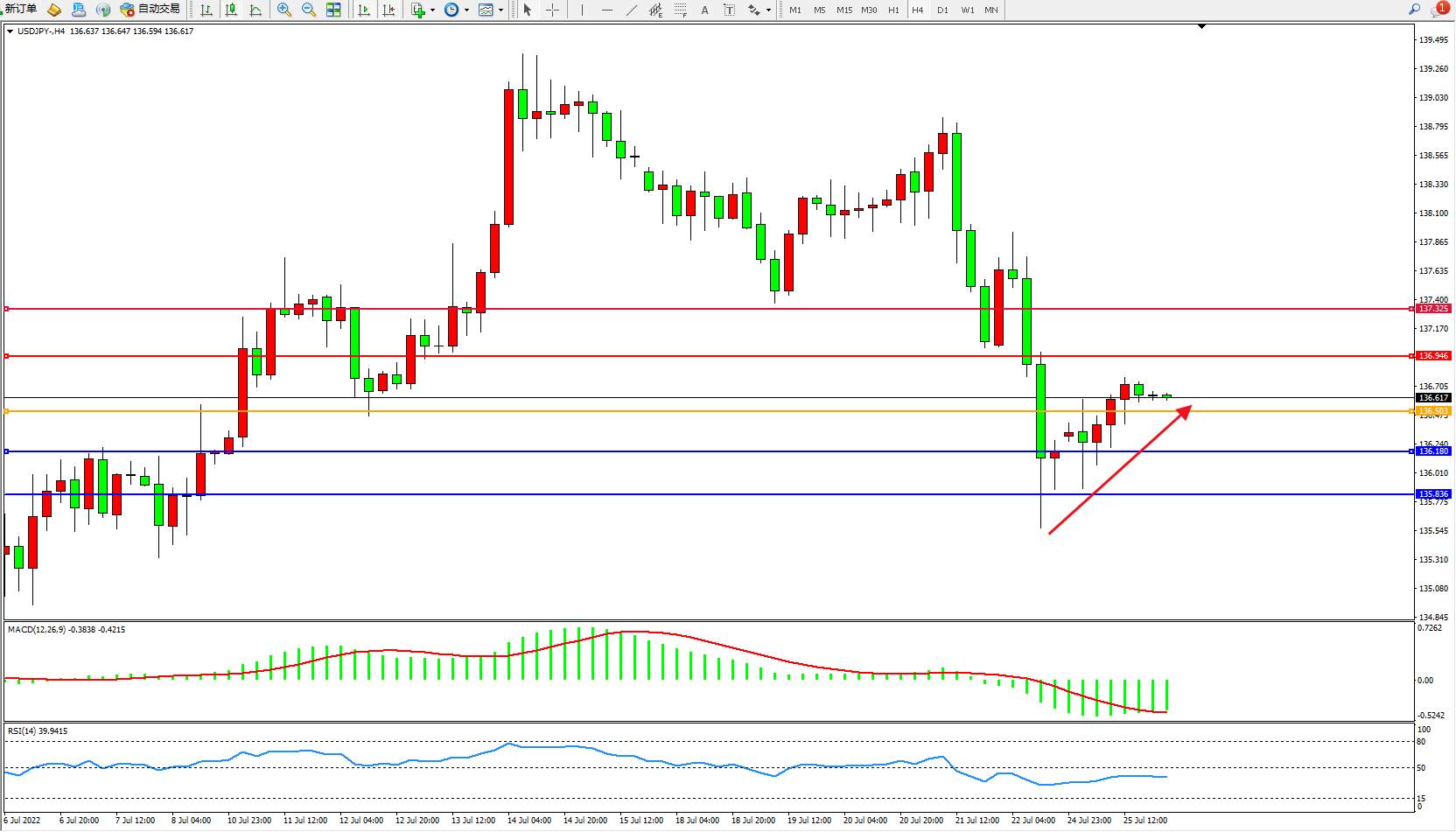 4小时图看:空头动力急速震荡下挫,低位得到支撑后,多头动力震荡上扬,短期你多头有伺机入场迹象,MACD指标处于空头区域维持整理平移,RSI指标处于50均衡线下侧徘徊中 ;