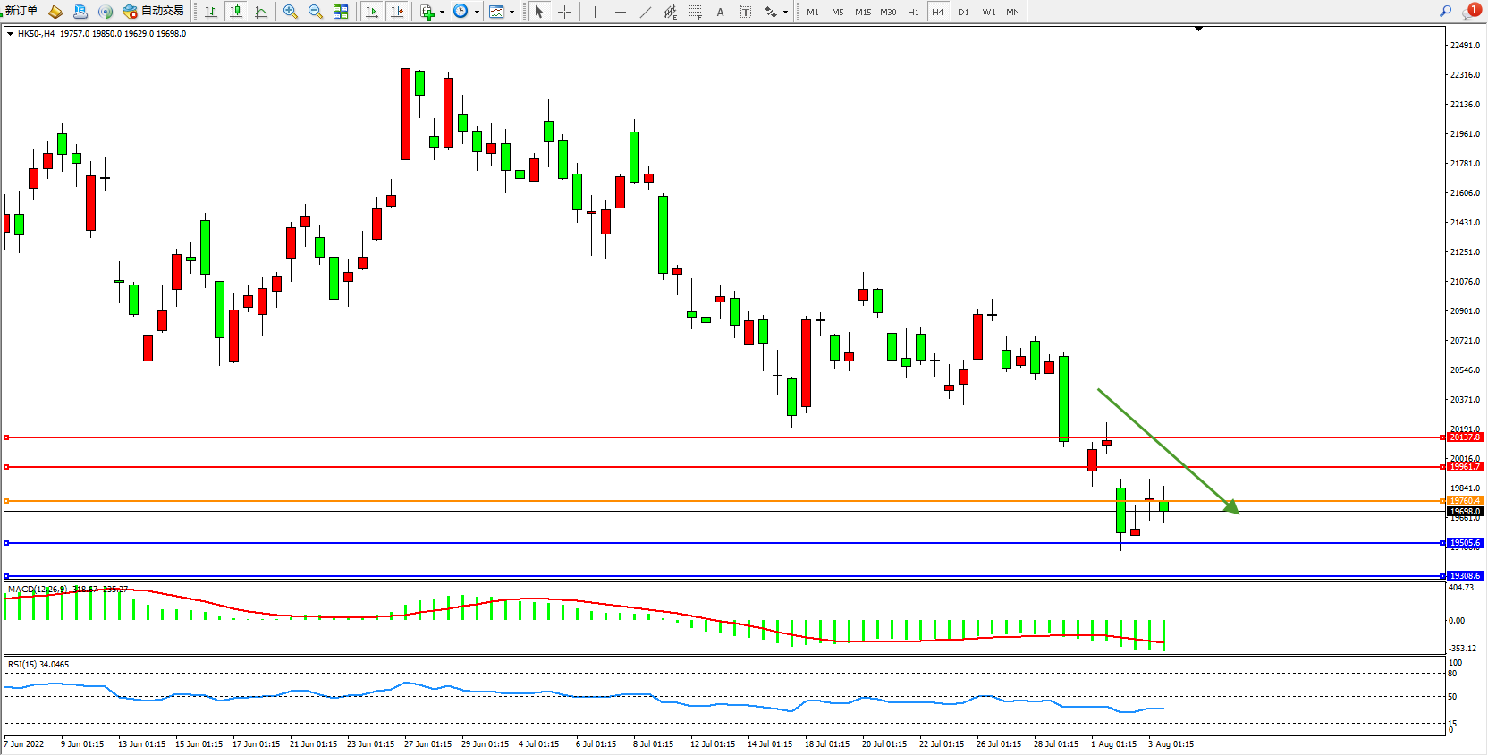 香港恒生指数8月3日(周三)收盘上涨77.88点,涨幅0.4%,报19767.09点;港股高开震荡,三大指数集体上涨,恒指尾盘曾一度转跌,收涨0.4%,国指、恒生科技指数分别涨0.52%和1.24%,三者均收假阴线。大型科技股表现活跃,阿里巴巴、快手涨约4%,腾讯、京东、网易皆上涨超2%;受地缘政治影响,军工股全天领涨,中航科工、中船防务表现最佳;半导体股盘中暴动拉升,中芯国际一度升超9%。