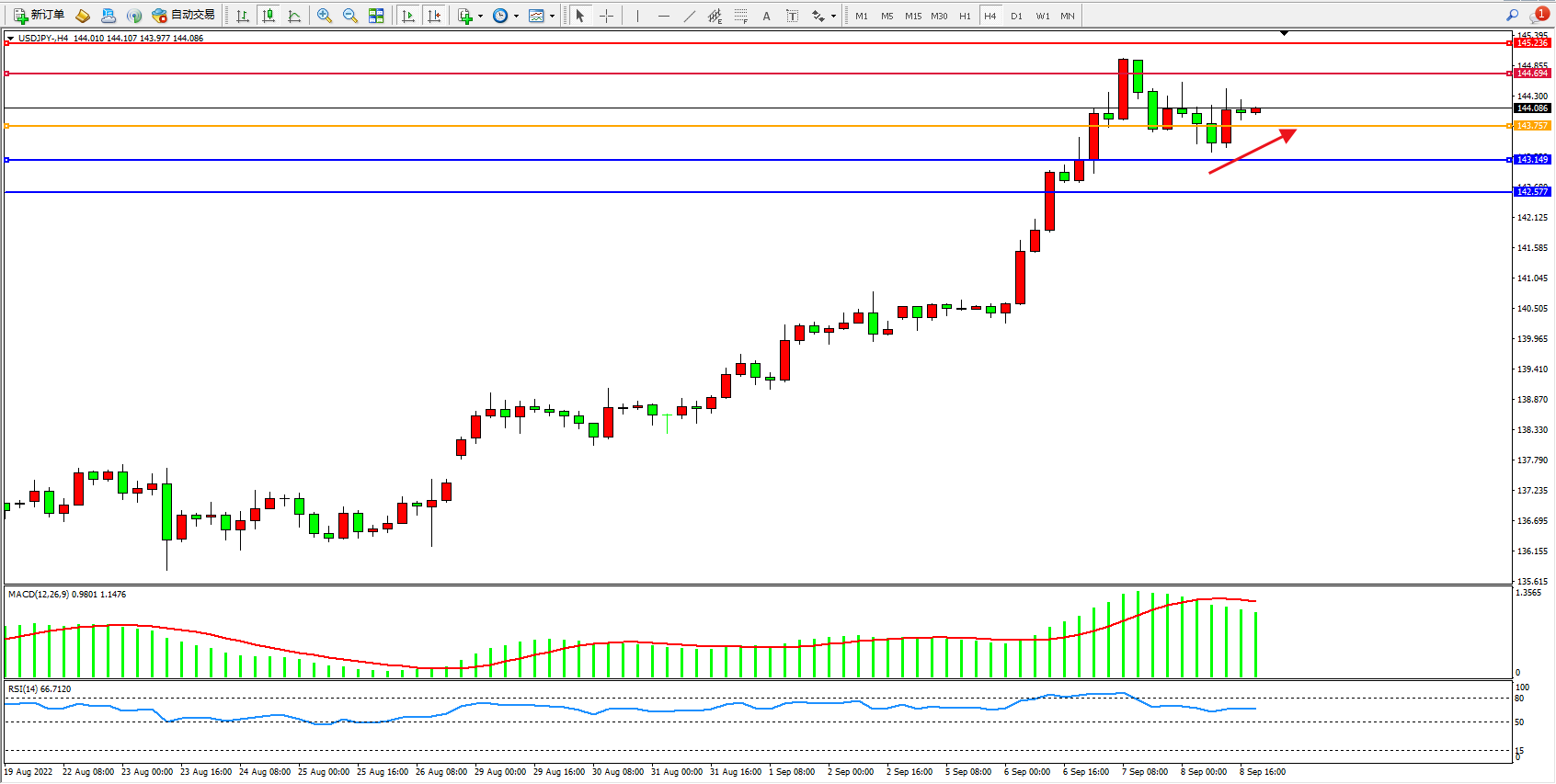 4小时图看:多头动力急速拉升后,高位窄幅整理,多头上行动力开始减弱,MACD指标处于多头区域维持徘徊,RSI指标处于多头区域维持整理;