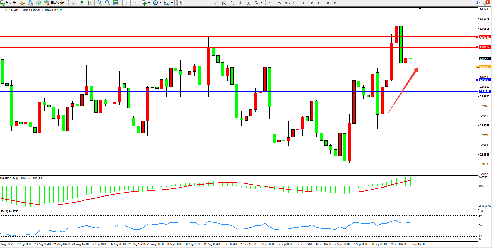 欧元兑美元维持1.00429附近震荡,欧央行9月加息75BP并明确未来加息进程将继续推进,在通胀压力可能进一步走高且存在高度不确定性的背景下(欧洲CPI年内可能破10%),年内欧央行同样可能执行“沃尔克式”的加息,以连续大幅度、超预期的紧缩力度打压通胀,10月议息会议同样存在加息75BP的可能性。