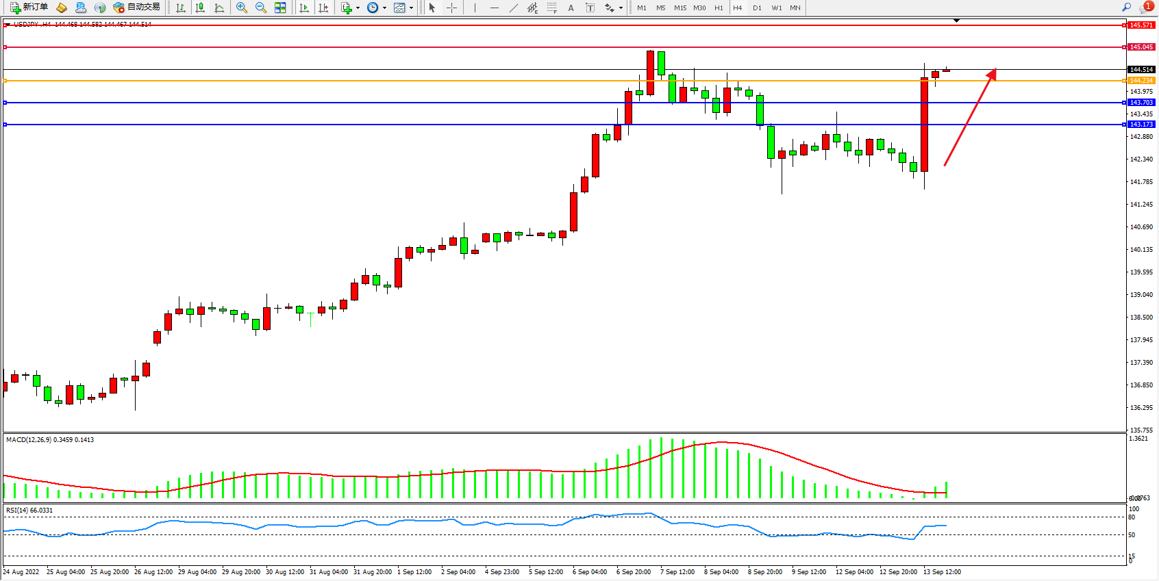 4小时图看:高位短期窄幅整理后,多头动力急速拉升,市场看涨情绪笼罩,MACD指标处于0轴线上側整理上移,RSI指标处于50均衡线上側整理;