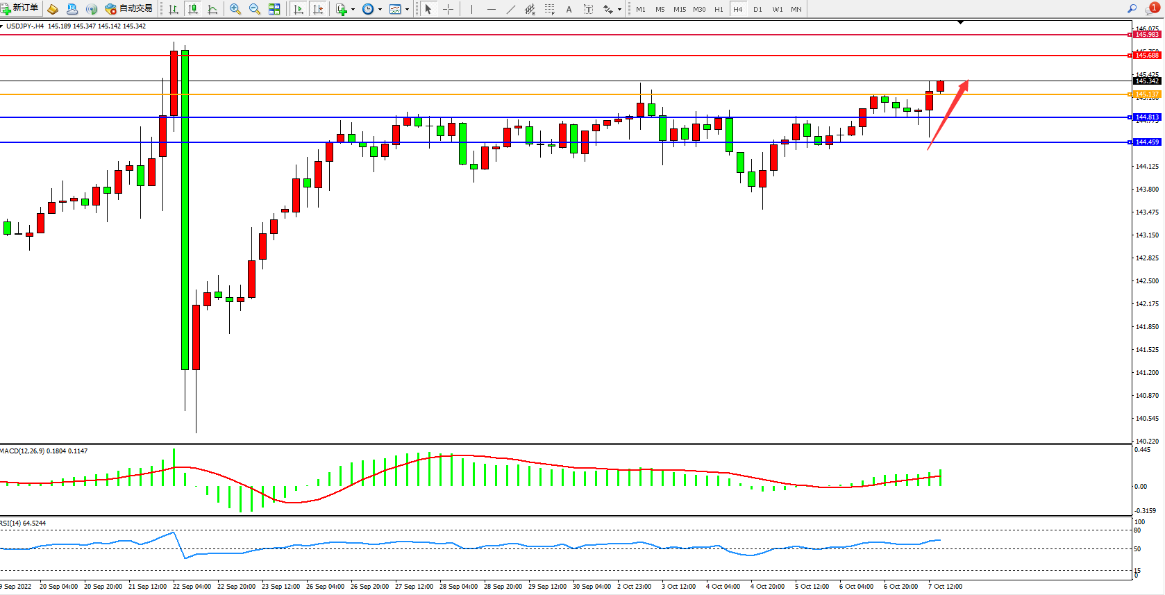 美元日圆USDJPY——4小时K线图显示: